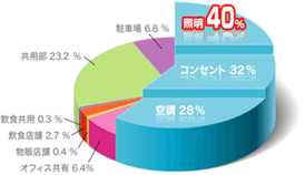 温室効果ガスの一種であるCO2発生の基となるオフィスでのエネルギー消費割合のうち、照明が約40%を締めています。今回当社が推進する次世代LED蛍光灯・LEDランプを導入すると、照明で消費しているエネルギーを約40%削減することができます。
